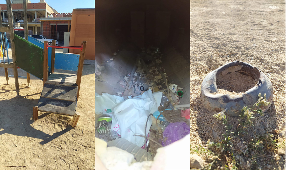 Ginés Raja ha señalado que “ejemplo de ello es el estado del parque situado en el barrio del Garbanzal, en la calle Rojo El Alpargatero, cuyo depósito que sirve de elemento decorativo se encuentra repleto de basura pudiendo convertirse en nido de plagas”.