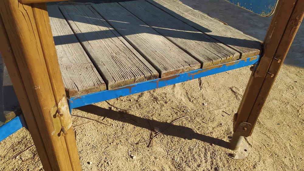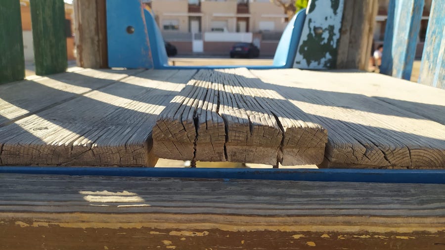 “Por si fuera poco, una valla presenta peligro de derrumbe; mantienen una base de una antigua farola (oxidada y cortante); láminas de maderas sueltas; tornillos salientes y oxidados… La obra maestra de esta dejadez se completa con la situación de los columpios, que fueron retirados y no han sido sustituidos por otros nuevos”.