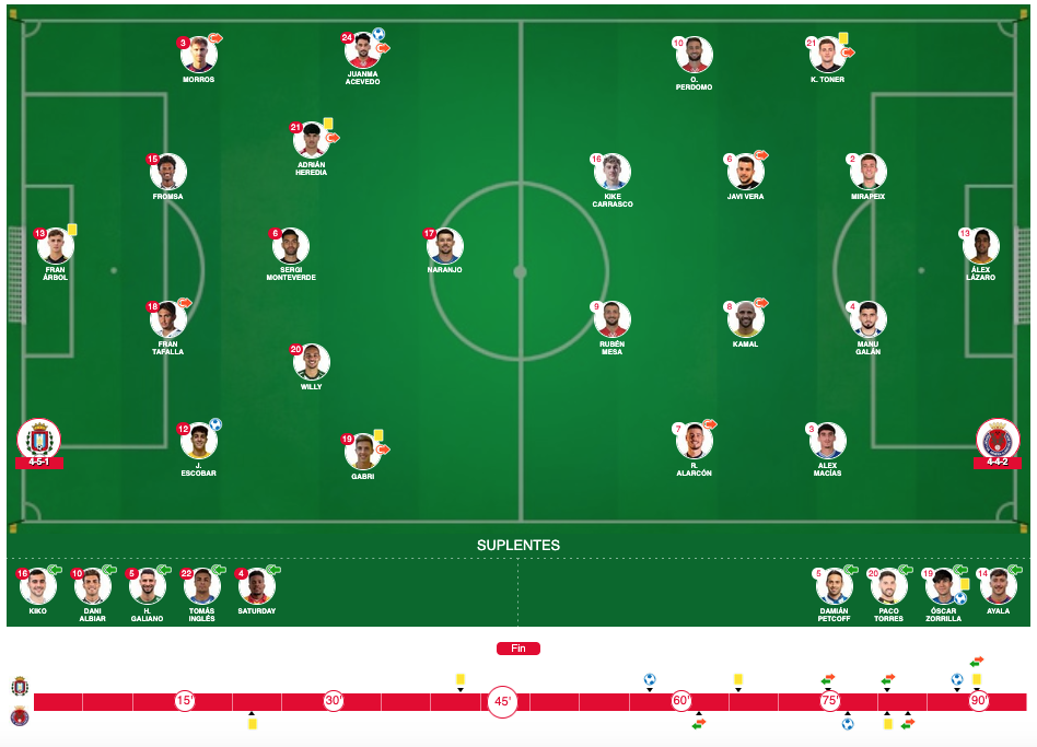 GOLES. 1-0. Minuto 57: Juanma Acevedo. 1-1. Minuto 77: Óscar Zorrilla. 2-1. Minuto 88: Jaime Escobar.
