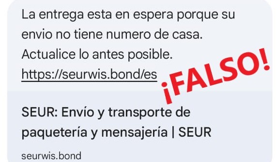 En este caso, CONSUMUR ha conocido el supuesto sms de SEUR, en el que se indica que “la entrega está en espera porque su envío no tiene número de casa. Actualice lo antes posible”, y facilitan un enlace web para ello, que si el usuario se fija con detenimiento puede comprobar que no corresponde a la dirección oficial de la empresa.