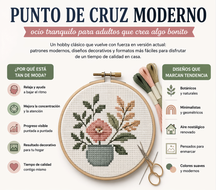 Esto hace que el punto de cruz encaje mejor en casas actuales y resulte mucho más atractivo para personas que quieren un hobby tranquilo, creativo y visualmente bonito.