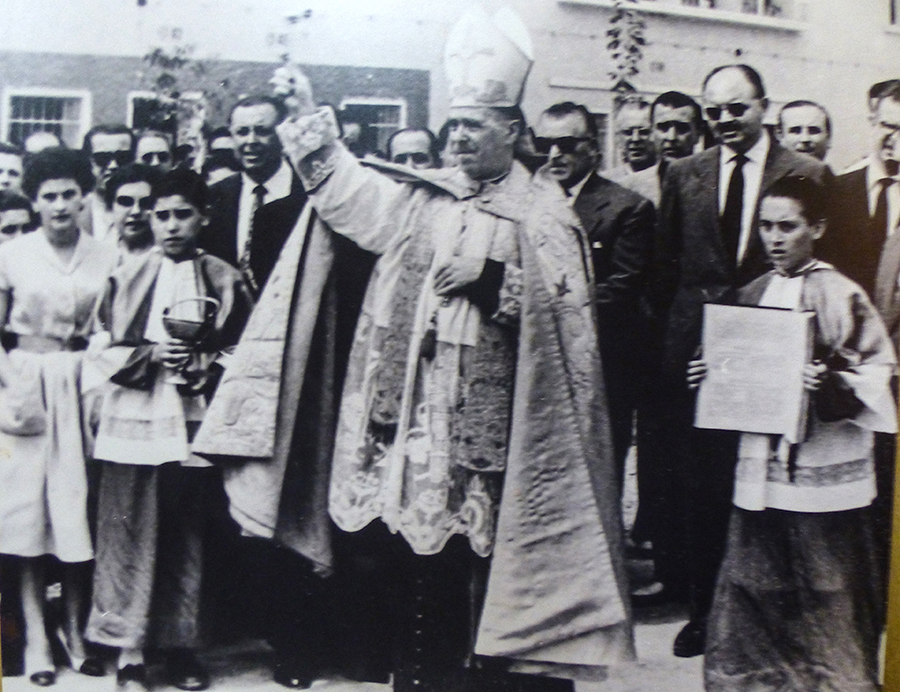 En la imagen superior se observan al fondo de las viviendas y en primer plano a entonces chaval Ginés Cabezos Gomariz. En la inferior, la bendición por parte del Obispo en presencia del alcalde de aquellos años, Francisco Barrionuevo, y numerosos vecinos.