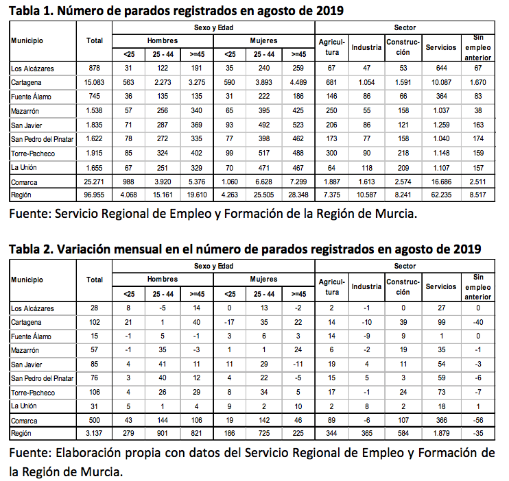 Por municipios, el número de parados ascendió en todos los de la comarca de Cartagena. Los mayores aumentos porcentuales en el número de parados en agosto se produjeron en Torre-Pacheco (+5,9%), San Javier (+4,9%), San Pedro del Pinatar (+4,9%), Mazarrón (+3,8%), Los Alcázares (+3,3%) y Fuente Álamo (+2,1%). El paro se incrementó en la comarca de Cartagena tanto entre los hombres como entre las mujeres de todos los grupos de edad.