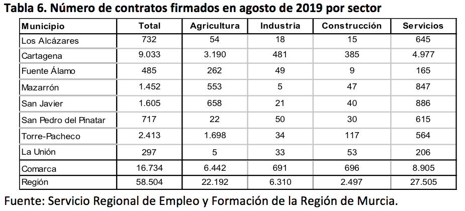 El número total de contratos firmados en la comarca de Cartagena en agosto de 2019 fue de 16.734 contratos, lo que supone 19.788 contratos firmados menos que en el mes de julio, un 54,2% menos. Los nuevos contratos firmados se redujeron con respecto al mes anterior en todos los sectores productivos, en especial en la agricultura (-65,7%) y en el sector servicios (-44,4%).