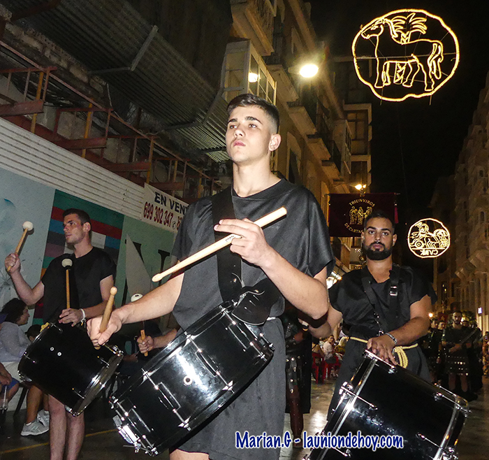 Varios componentes de la banda de cornetas y tambores Virgen de la Caridad de La Unión están participando en los desfiles de las fiestas de Carthagineses y Romanos marcando el paso de los componentes de la legión Triunviros de Carthagonova por el centro de la ciudad.