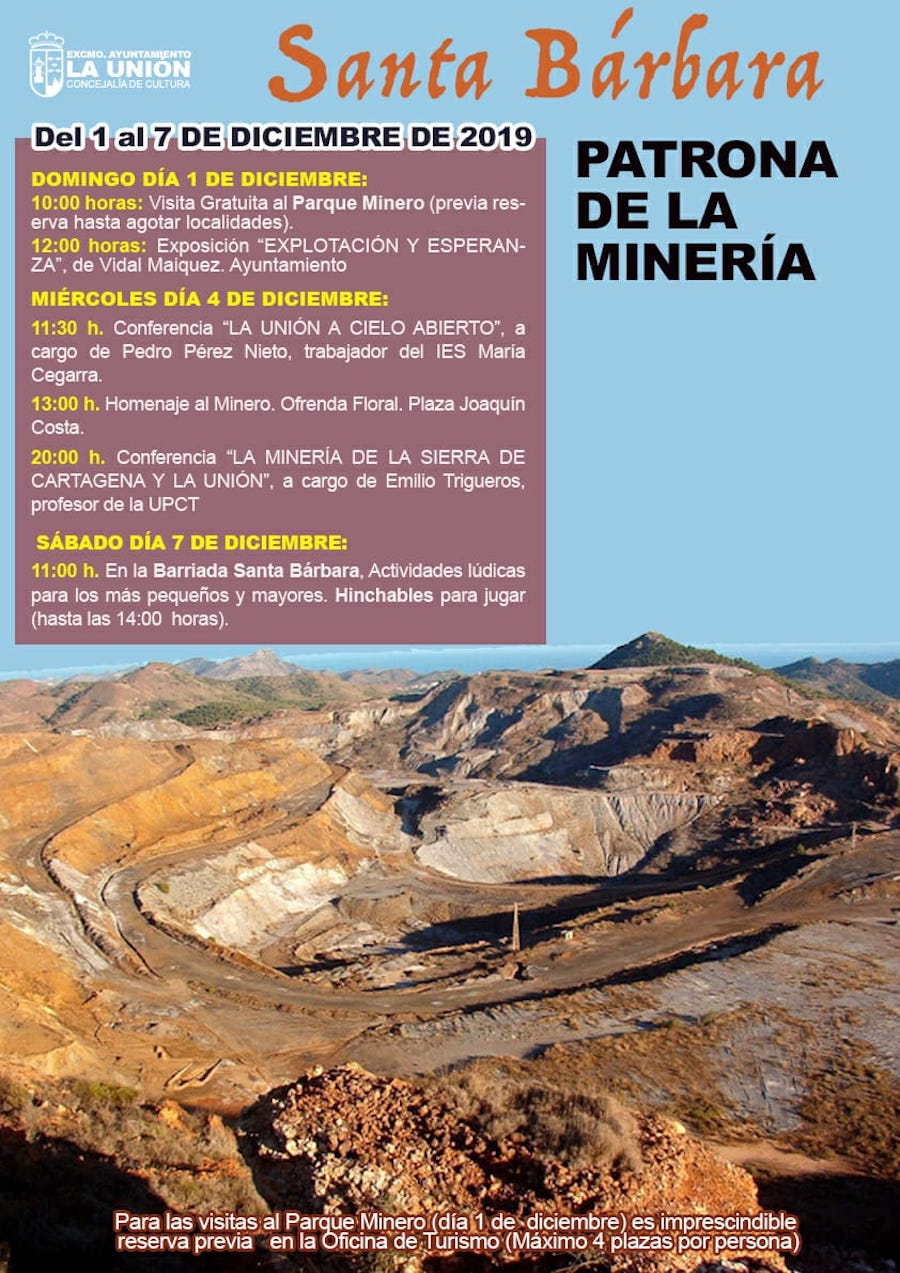 La celebración de la patrona de la minería comenzará este próximo domingo con visita gratuita al Parque Minero y una exposición, para el día 4 continuar con dos conferencias y el homenaje al minero. Culminarán los actos el 7 de diciembre con una jornada lúdica en la Barriada Santa Bárbara.
