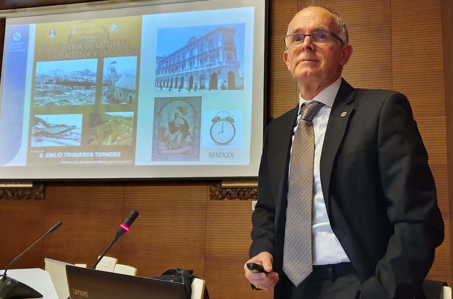Emilio Trigueros Tornero, profesor de la Universidad Politécnica de Cartagena, ofreció una charla sobre la sierra minera ("el extremo más oriental de la cordillera Bética cuya capital es La Unión"), que se puede ver y escuchar a través del vídeo elaborado por 'la-union-ciudad-del-cante-y-minera.es' y que tiene alojado en su sección 'La minería en La Unión': pinchar aquí