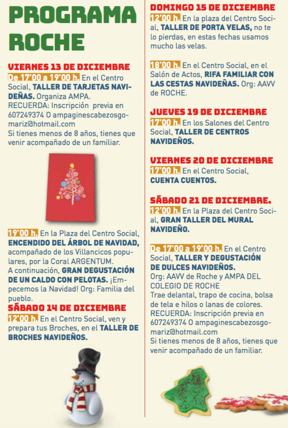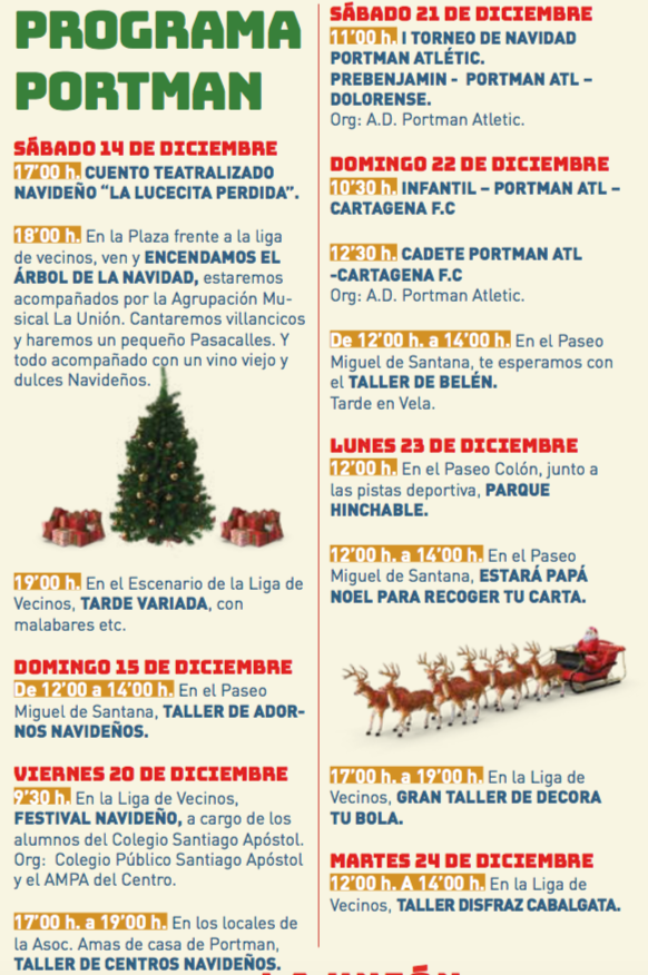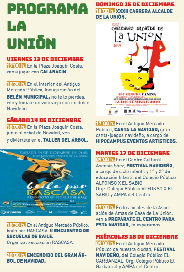 Hoy se inaugura el Belén de La Unión y será iluminado el árbol de Navidad de Roche. El sábado le tocará el turno al de Portmán y al unionense, además de tener lugar el encuentro de academias de baile Rascasa en el Antiguo Mercado Público. El domingo el protagonismo principal lo coge la carrera Alcalde de La Unión y sus diferentes modalidades, incluida la marcha senderista y la prueba canina.