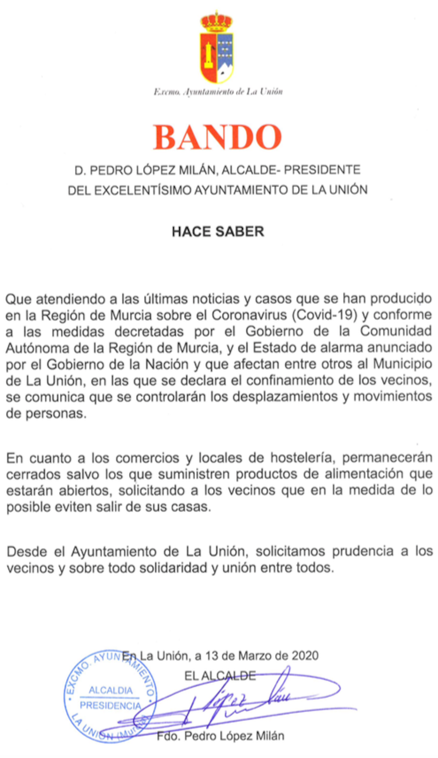 El alcalde de La Unión ha emitido un bando para comunicar a la ciudadanía que, tras ser declarado el confinamiento de los vecinos, "se controlarán los desplazamientos y movimientos de personas" y que estará cerrados comercios y locales de hostelería, salvo los que suministren productos de alimentación". La Policía Local se está encargando de controlar que estas medidas se lleven a cabo.