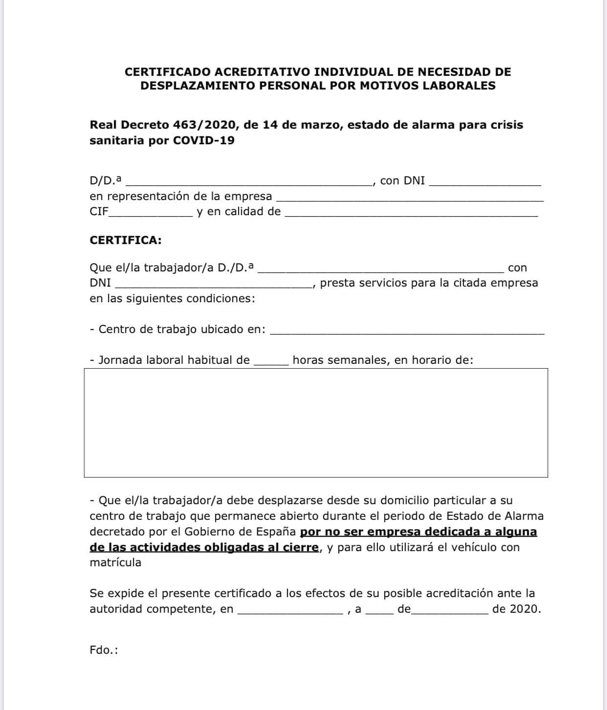La Policía Local de La Unión ha colgado en su perfil de Facebook un formato de certificado acreditativo individual por motivos de trabajo para que sea rellenado por las empresas y así evitar que tengan problemas sus empleados. A través de este artículo también se puede descargar.
