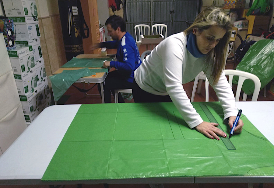 La cochera por taller y manos a la obra... Telas, gomas, bolsas de basura grandes y pequeñas, esparadrapo, máquina de coser, tijeras y contactos telefónicos con amigos, conocidos y tiendas de suministros.