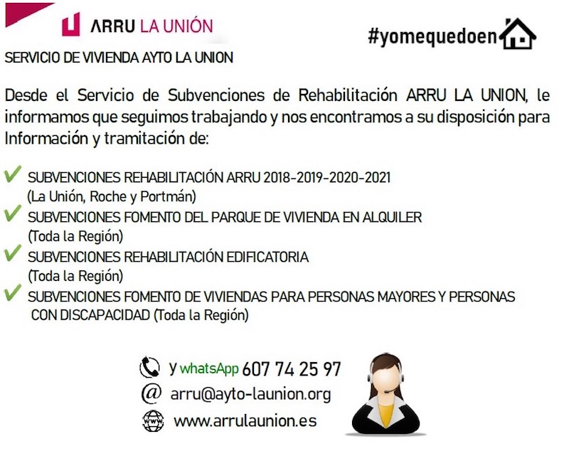 El Ayuntamiento de La Unión informa que el servicio ARRU continúa a disposición de los vecinos a través de vías telemáticas.