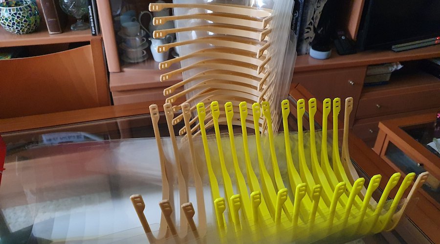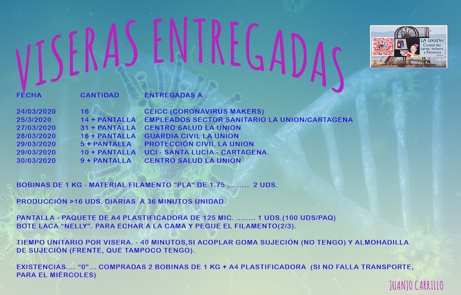 Al principio fabricó sólo 16 viseras, que entregó en Cartagena, pero después ha decidido crear también pantallas, entregando de forma preferencial los equipos a la gente de su tierra. En los lugares de destinos se ensamblan las piezas y proceden a su desinfección ante del uso. Ahora la producción en la impresora 3D se paraliza hasta que llegue el material (lo paga el propio Juanjo Carrillo) durante esta semana.