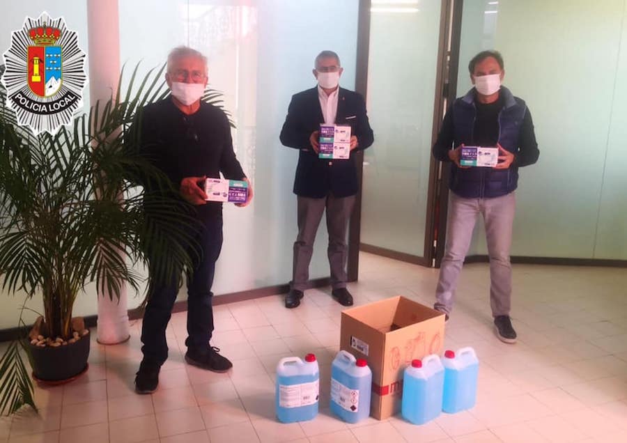 José Francisco Beltrán, gerente de la empresa unionense Suministros Mayor, ha hecho entrega en el Ayuntamiento de 500 mascarillas y 20 litros de desinfectante, que han recogido el alcalde, Pedro López Milán, y el concejal José Solano.