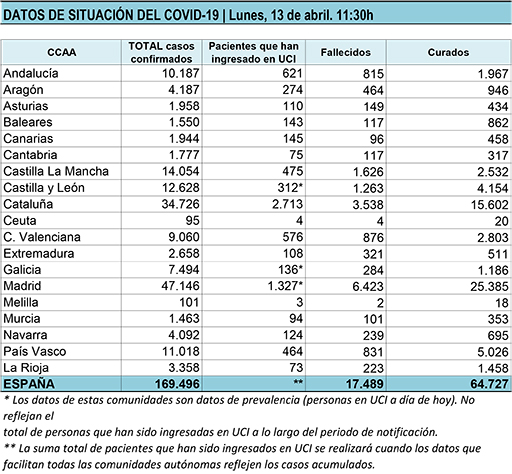 Casos totales: 169.496 (+3.477). Últimas 24 horas: 3.477 (-690). Recuperados: 64.727 (+2.336). Fallecidos: 17.489 (+517). La cifra de muertes experimentan su tercer día de descenso y fija la marca más baja de los últimos veinte días. La cifra de altas médicas está en torno al 38% del total de afectados por el coronavirus.