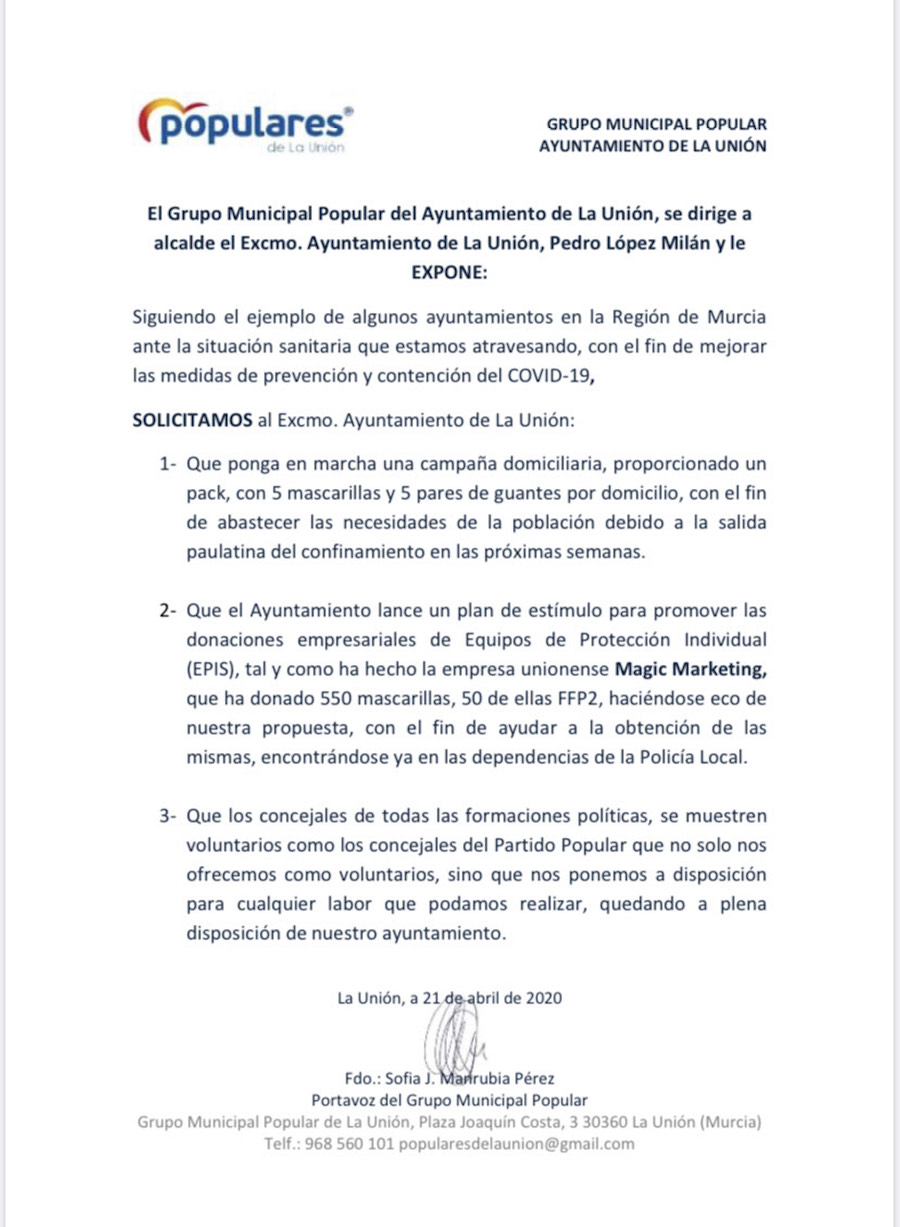 El Grupo Municipal Popular ha registrado un nuevo escrito al ayuntamiento solicitando y siguiendo el ejemplo de algunos ayuntamientos en la Región de Murcia ante la situación sanitaria que estamos atravesando, con el fin de mejorar las medidas de prevención y contención del COVID-19 los siguientes puntos: