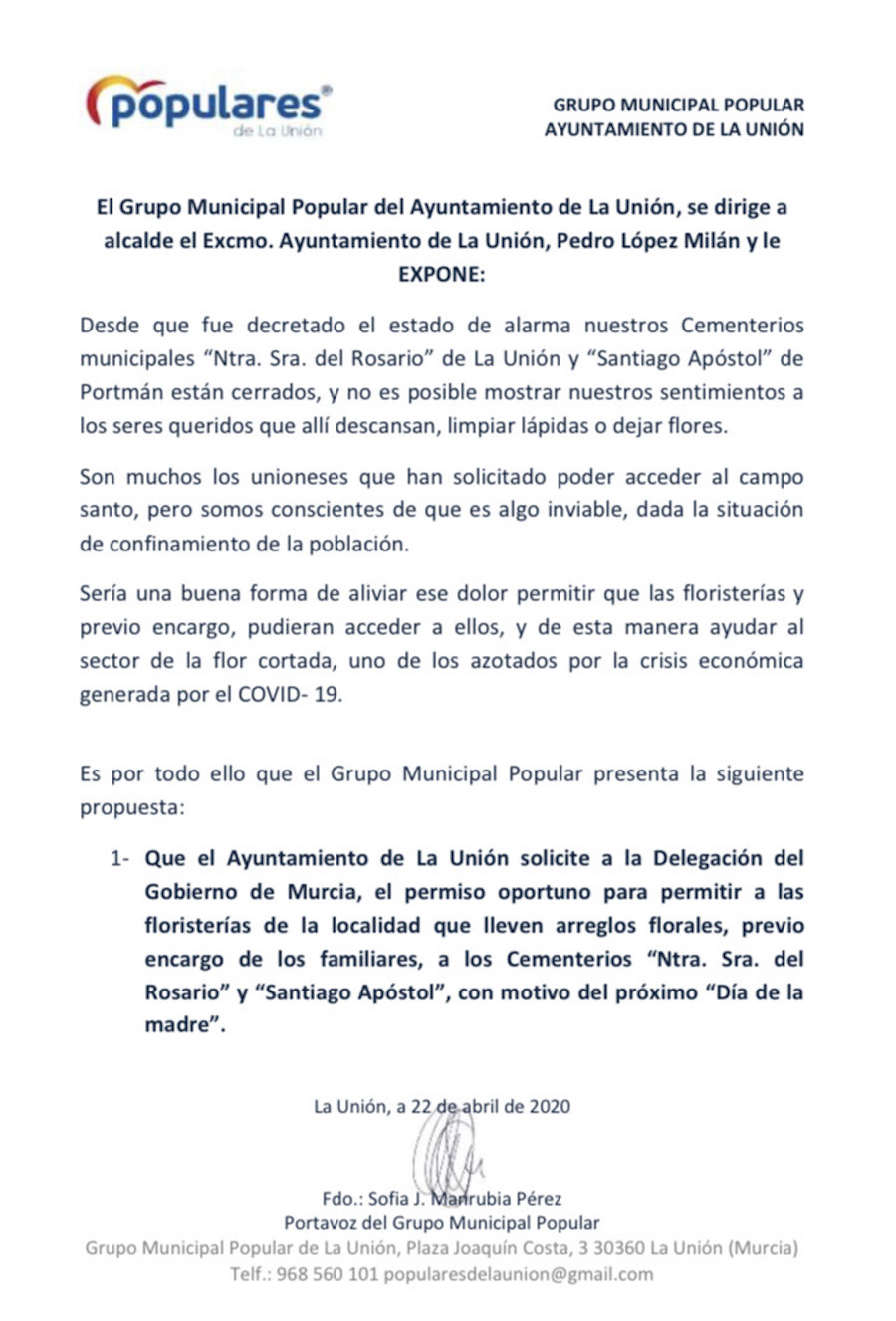 El PP propone al Ayuntamiento que solicite a la delegación del Gobierno en la Región de Murcia autorización para que las floristerías puedan llevar arreglos florales a los cementerios previo encargo de las familias. Asimismo, solicita al Gobierno municipal poner en marcha una campaña domiciliaria de entrega de mascarillas y guantes de protección ante el coronavirus y que estimule las donaciones de EPIS por parte de empresas.