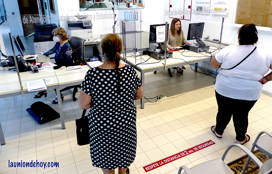 La Unión sigue avanzando en su desescalada con el regreso de servicios y actividades, como hoy han sido la atenció presencial en el registro general del Ayuntamiento y el mercadillo de Roche, como se observa en las imágenes adjuntas, que se caracterizan en recuperar lo que eran escenas habituales pero ahora acompañadas por las medidas de seguridad generadas por la crisis sanitaria del coronavirus.