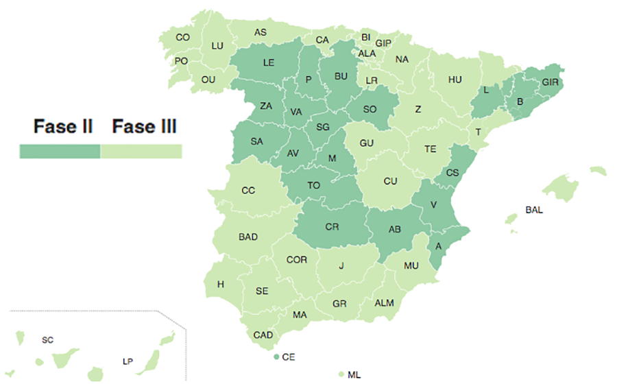 El ministerio de Sanidad ha dado a conocer los cambios de etapa ha la nueva normalidad en los territorios, no quedando ya provincia alguna en Fase 1.