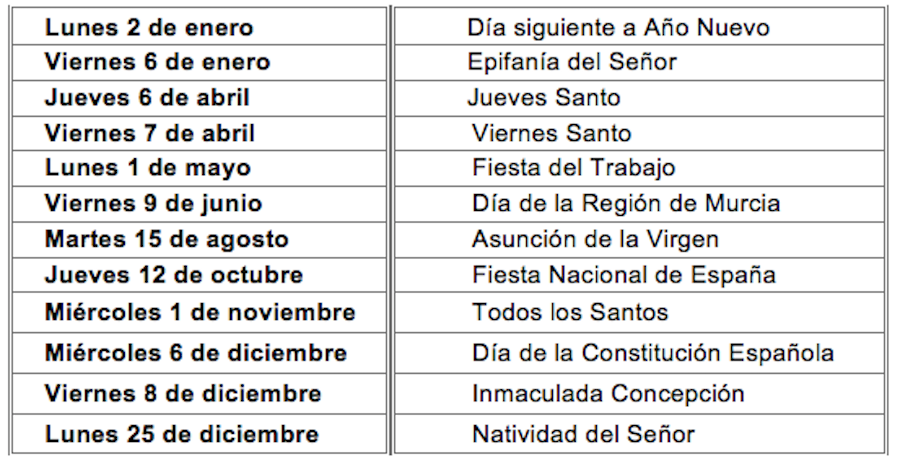 Así, las fiestas laborales en todo el ámbito territorial de la Región para 2023 serán, además de todos los domingos, las siguientes: