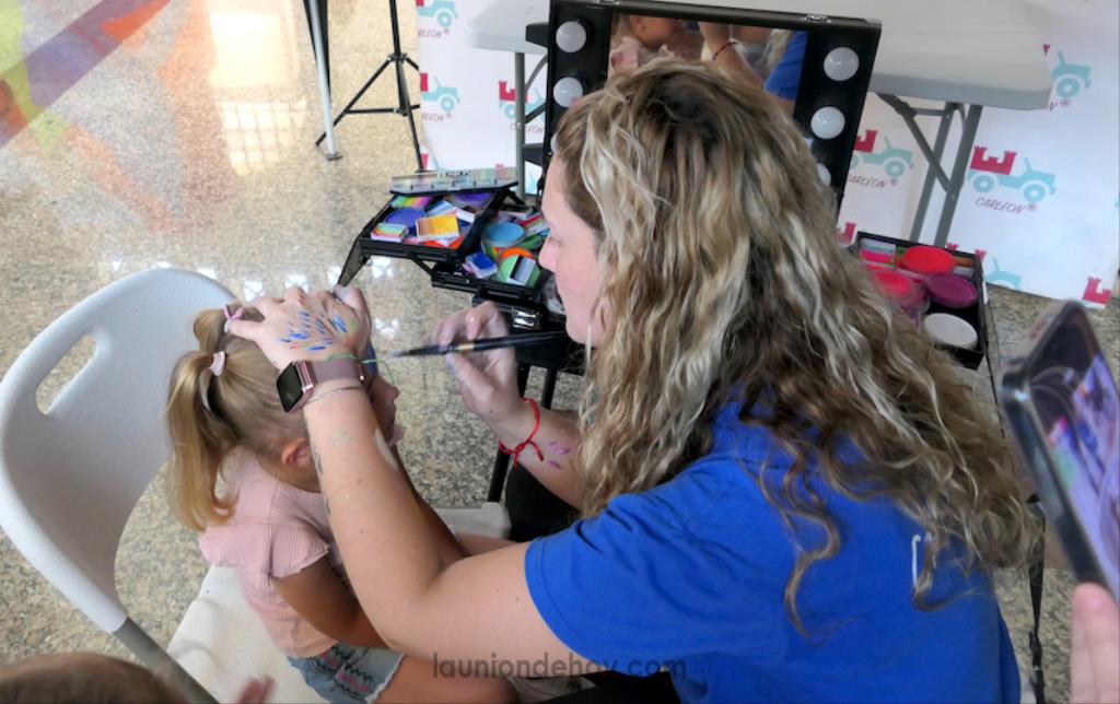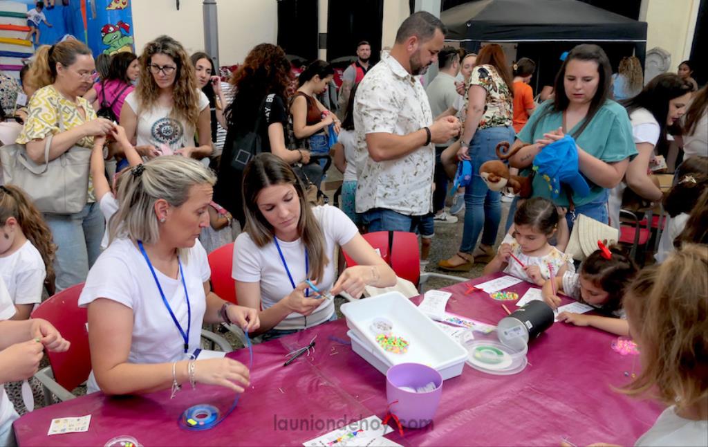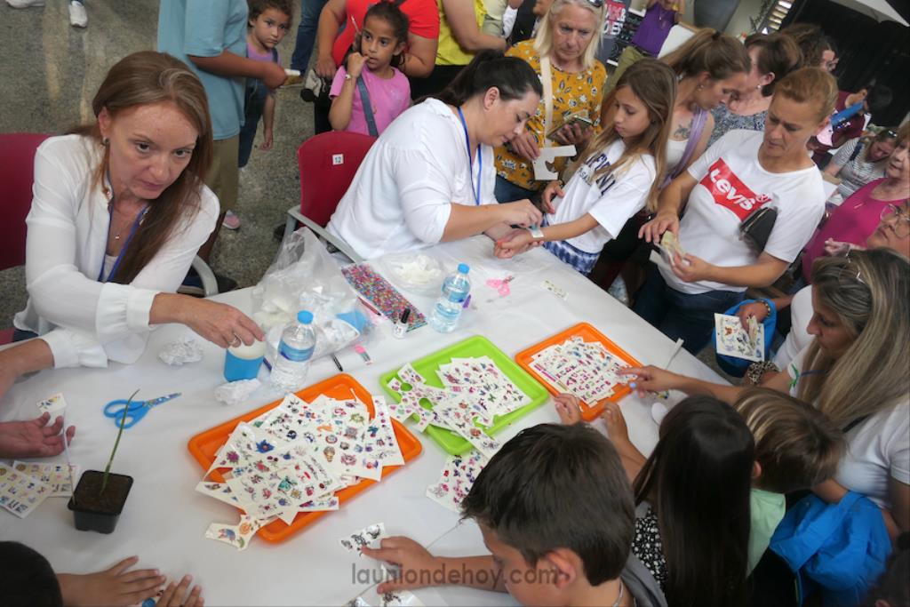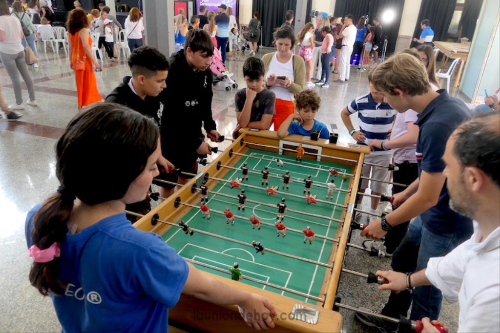 En los laterales estaban las zonas de diversión más pasiva, como el futbolín, karaoke, fotomatón, vídeo giratorio y pintacaras, además de talleres muy variados que atraían a decenas de pequeños, al igual que, ahí ya con más acción, los hinchables.