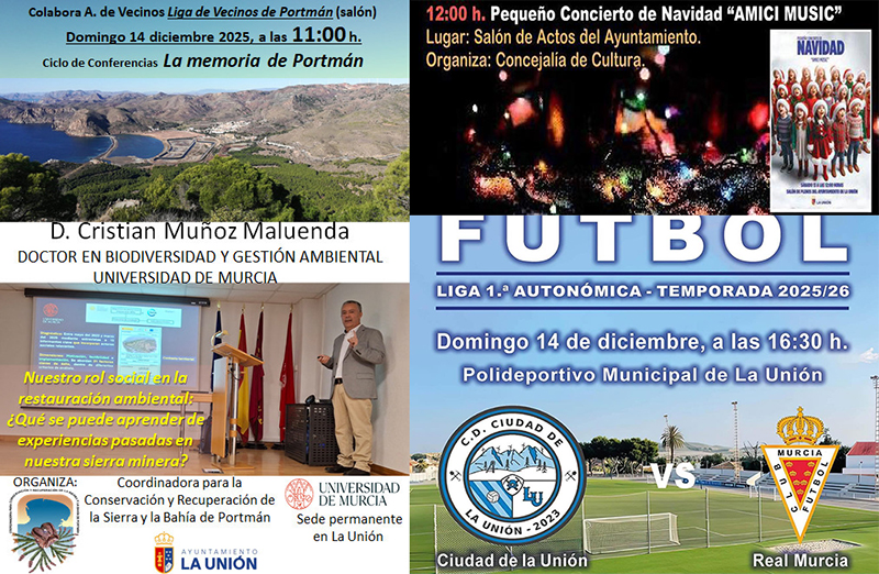La Navidad va cobrando fuerza en los actos de los fines de semana, estando esta vez los focos en el concierto de 'Amici Music' de la ciudad de La Unión y en el encendido de la iluminación en Portmán, lugar donde el domingo hay también una conferencia. En el deporte, el Ciudad recibe al Real Murcia C en la tarde del domingo y viaja el CB Sierramar sénior. En las categorías de base también ofrecemos rivales, fechas y horarios de fútbol sala, baloncesto y voleibol.