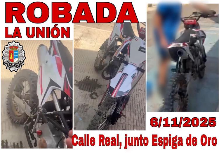 La Policía Local de La Unión difunde las fotografías de la motocicleta que ha sido sustraída esta semana en la calle Real de la ciudad. Por otro lado, también se indica que en las últimas semanas han actuado en dos inmuebles de zonas rústicas con 'okupas'.