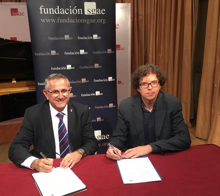 El presidente de la Fundación Cante de las Minas y alcalde de La Unión, Pedro López Milán, y Rubén Gutiérrez, director general de Fundación SGAE, rubrican el marco de colaboración con sus respectivas firmas en el documento de colaboración respecto a la 59 edición del gran certamen, que se celebrará del 31 de julio al 10 de agosto en el Antiguo Mercado Público.
