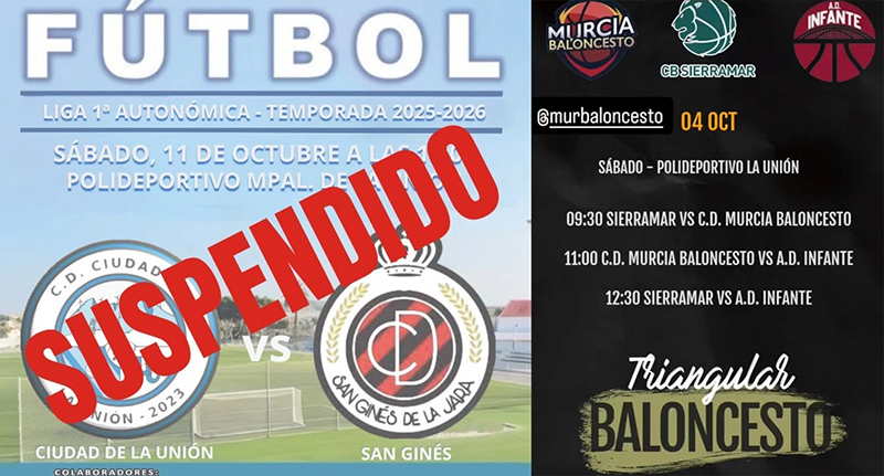 El partido de segunda autonómica de fútbol CD Ciudad de La Unión-San Ginés de la Jara y el triangular de baloncesto entre CB Sierramar, CD Murcia y AD Infante, que estaban programados para este sábado en la ciudad minera, también quedan aplazado por la situación climática. A ello se suma que la concejalía de Deportes ha anunciado la suspensión de todas las actividades deportivas de sábado y domingo.