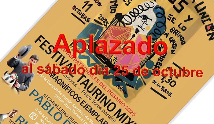 La empresa organizadora del festejo taurino y la comisión organizadora, en coordinación con el Ayuntamiento de La Unión y todas las partes intervinientes en el cartel anunciado, han decidido aplazar la celebración del evento relacionado con el mundo del toro previsto para este sábado 11 de octubre, debido a la adversa situación meteorológica que se está dando durante estas jornadas.