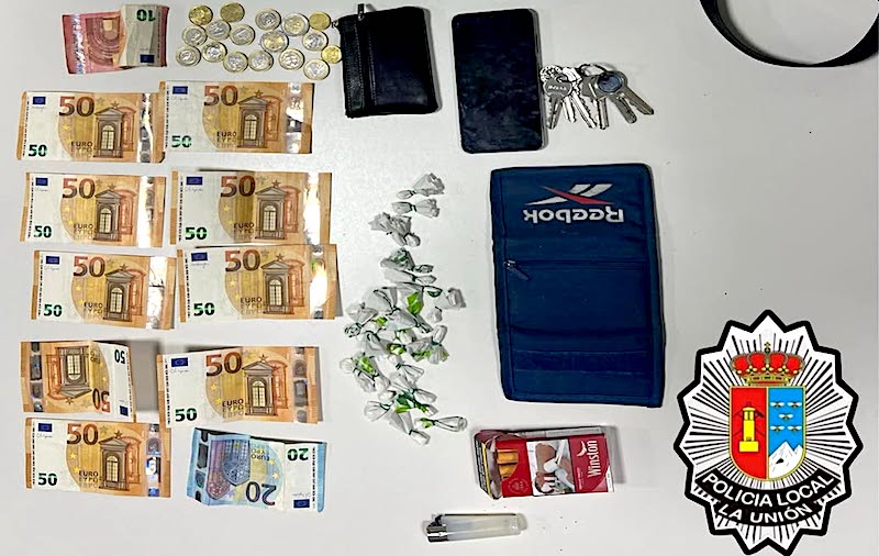 La Policía Local de La Unión informa que, en el cacheo practicado a una persona que estaba consumiendo alcohol en un vehículo, descubrieron que llevaba 25 dosis de cocaína y casi quinientos euros en metálico, considerando que había indicios de que se dedica a la venta ilegal de esta sustancia, siendo detenido y trasladado al cuartel de la Guardia Civil como sospechoso de un delito contra la salud pública.