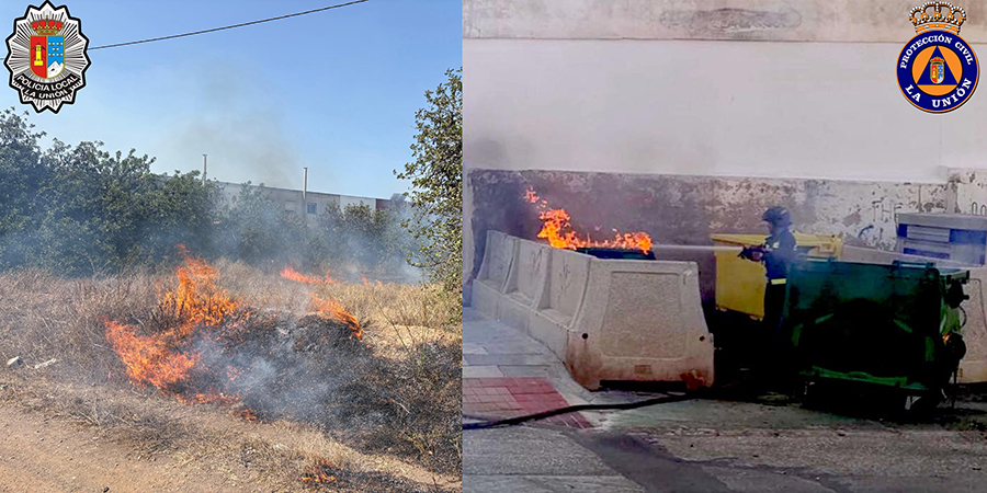 Protección Civil y Policía Local informan de dos fuegos que se han declarados en las últimas fechas, uno en 3 contenedores en la zona urbana de La Unión y otro en unos matorrales, próximos a unas viviendas.