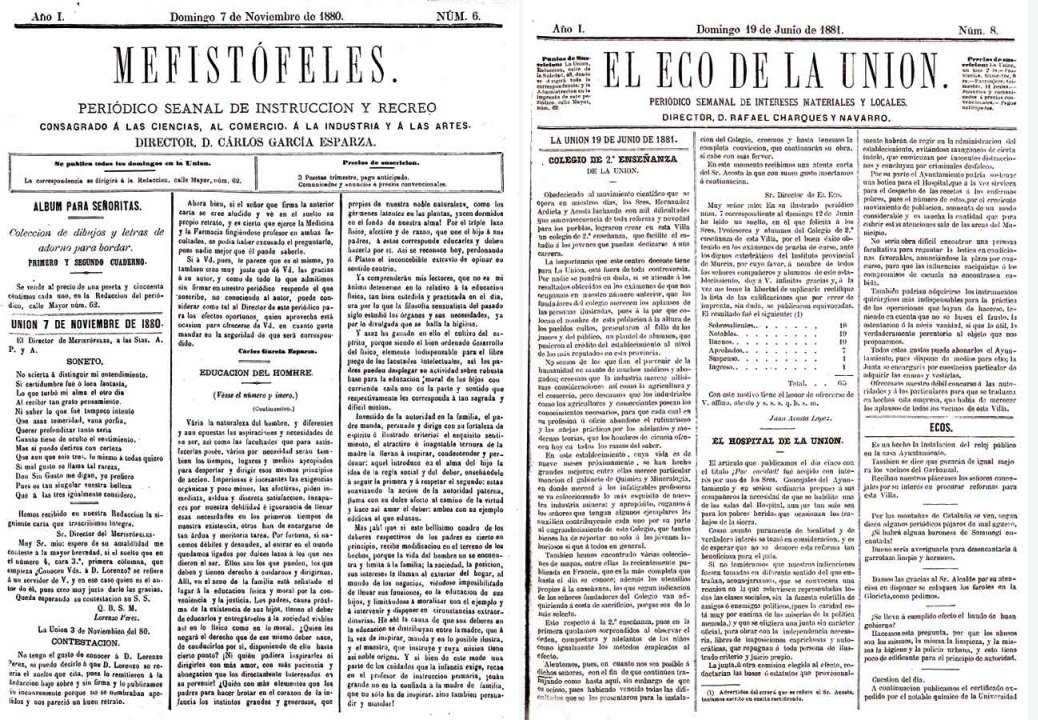El primer periódico editado en La Unión fue 'El faro unionense', un semanario que surgió en febrero de 1871 y se extinguió ese mismo año. Una década más tarde surgió 'Mefistófeles', también de duración fugaz, al igual que 'La Unión', de 1980. Al año siguiente apareció 'El eco de La Unión' para difundir las noticias locales, pero 'apartándose de la política'. También duró unos meses, aunque un lustro más tarde resurgió. Después llegron 'El Botón' (1882) y 'El Minero', que duró hasta 1884.