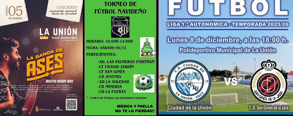 Llega el camino hacia la Navidad de forma oficial con la inauguración del Belén municipal y el encendido de la illuminación, en una tarde-noche aderezada por la música de 'Banda de ases'. En el deporte, Roche acoge los tres partidos del CD Vedruna de fútbol sala y en fútbol el lunes juega el Ciudad y el sábado hay un torneo en Portmán. No hay jornada de baloncesto.