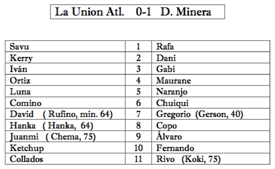 En la jugada del gol, Fernando estuvo mucho más espabilado que la zaga local y le ganó la espalda al ultimo defensor Ortiz, el cual le hizo penalti y se llevó la cartulina amarilla que le obligó a abandonar el terreno de juego. Marcó la Minera y partir de ahí La Unión remaría contra corriente.