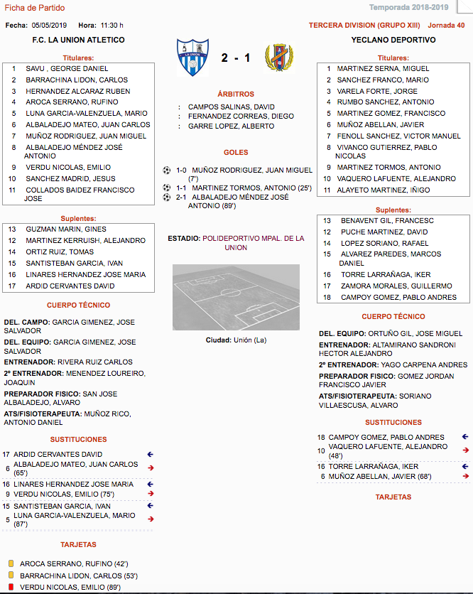 Cuando parecía que el encuentro frente al Yeclano, líder de la categoría, iba a cerrarse con un empate y que las opciones blanquiazules de evitar el descenso iban a ser mínimo, llegó en el minuto 93 el determinante gol del jugador unionense, a quien se observa en la imagen con Juanmi, autor del primer tanto.