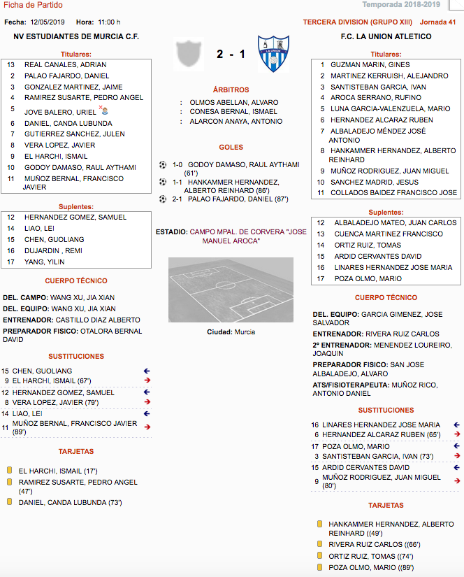 Del partido disputado en Corvera frente al Estudiantes, indicar que el encuentro no varió el marcador hasta la última media hora. Se adelantó el Estudiantes, empató Hanka en el minuto 86 y uno más tarde volvió a marcar el cuadro murciano, cuya esperanza de evitar el descenso a Preferente son muy remotas, pues pasan por conseguir una amplia goleada en la última jornada, que pierda el Cartagena B y que no gane La Unión Atlético.