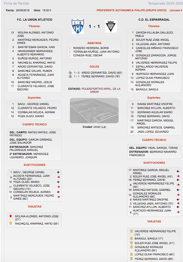 La Unión Atlético, con nuevo entrenador, suma frente a El Esparragal su primer punto de la temporada en Preferente, en un encuentro que disputó más de setenta minutos con un jugador menos por expulsión de Molina.