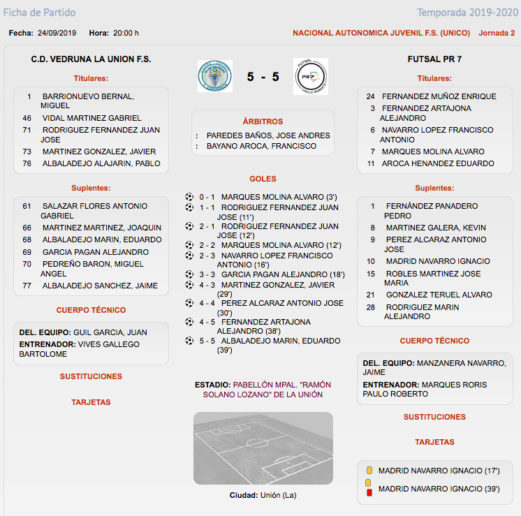 El CD Vedruna de Liga Nacional empató con Futsal PR7 en un partido pleno de alternativas en el que la máxima ventaja de uno u otro contendiente fue de un gol, acabando con el marcador de 5-5. En División de Honor, claras derrotas del conjunto uniones tanto en categoría cadete (0-11) como infantil (11-1) ante el mismo adversario, Aljucer El Pozo, que es líder en ambas clasificaciones.