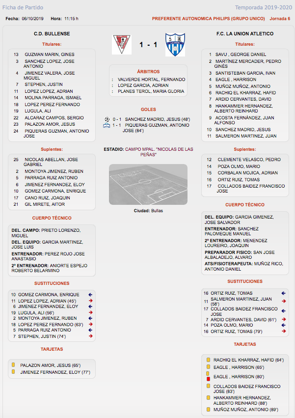 La Unión Atlético, penúltimo en la tabla, arranca un empate del feudo del CD Bullense, segundo clasificado en invicto, en un partido en el que se adelantó en el marcador con un gran gol de Ketchup (en la foto) y en el que encajó un gol en los minutos finales desde el punto de penalti. Debutó como blanquiazul Harry (imagen lateral), quien demostró calidad pero que fue expulsado en el minuto 80 al recibir la segunda cartulina amarilla.