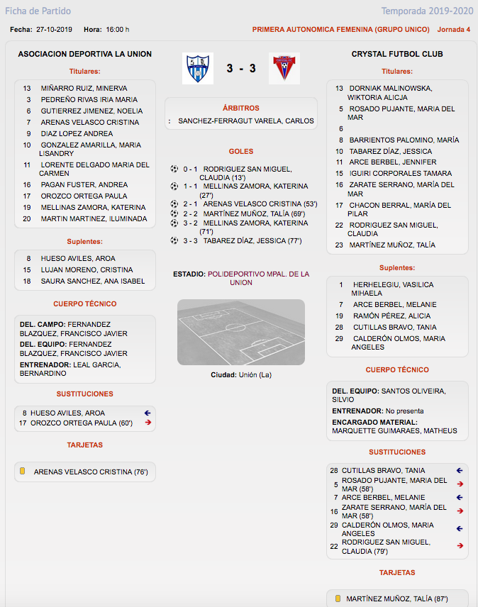 El equipo femenino de Primera Autonómica Femenina registra, con dos goles de Katerina Mellinas y uno de Cristina Arenas, un 3-3 en el marcador un duelo frente al Crystal Fútbol Club marcado por las alternativas pero también por el juego bronco, las interrupciones y una lucha continua de sus protagonistas.
