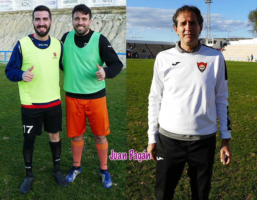 El meta unionense Molina con Bello, exjugador de La Unión ahora en el Cieza. A la derecha, Francisco Moreno, técnico local
