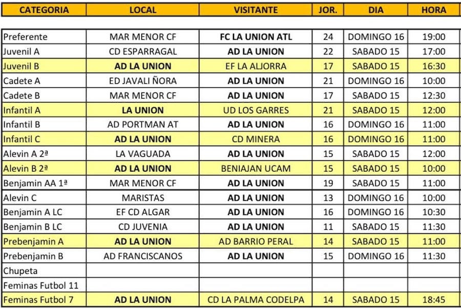 La Unión Atlético visita al Mar Menor el domingo por la tarde, con arbitraje de Adrián Jiménez. Los de San Javier son novenos enla tabla con 30 puntos, ocho menos que los unionenses. En cuanto a las bases, la AD La Unión tendrá en liza a dieciséis equipos este fin de semana. En fútbol femenino descansa esta semana la AD La Unión de primera autonómica.