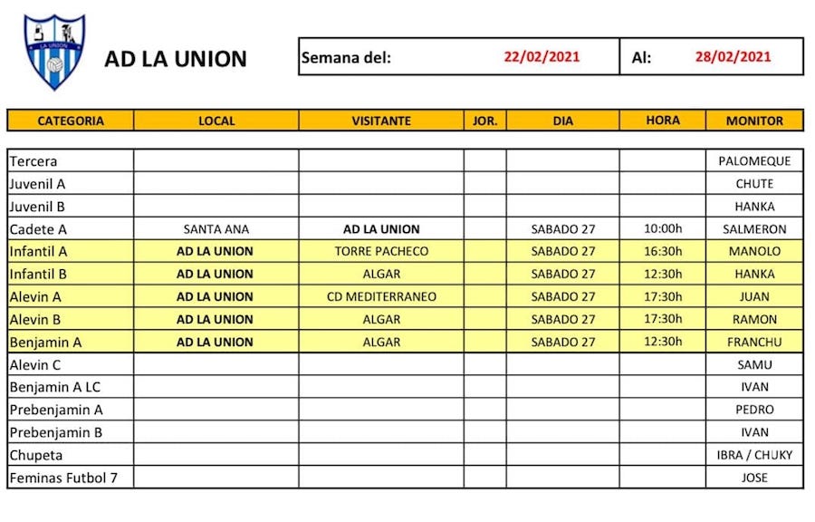 La Unión Atlético visita en Tercera Divisón al Cartagena FC este domingo. Por otro lado, seis equipos de la AD La Unión regresan hoy a la competición, con cinco partidos que se disputan en el polideportivo unionense 'Antonio Sánchez'.
