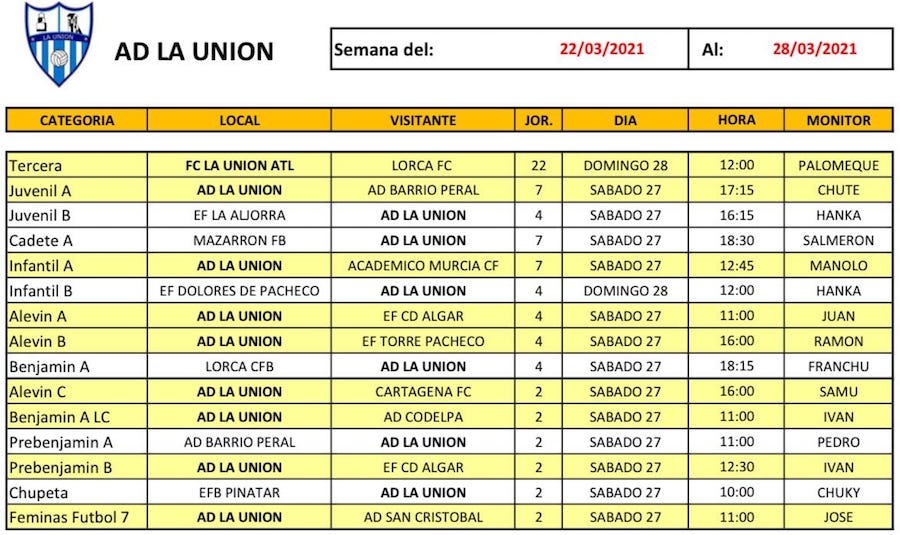 La Unión Atlético jugará este domingo, a las 12 horas, en dos campos, pues debe ganar en casa al Lorca y esperar que no lo haga el Rácing Murcia frente al Cartagena FC para meterse en la fase de ascenso. Por su parte, el fútbol base presenta catorce partidos, trece de ellos en sábado. El Atticus de hockey inicia la liga regional el sábado en Santomera y también afrontan diversos compromisos de competiciones federadas el CB Sierramar y el CD Vedruna de fútbol sala.