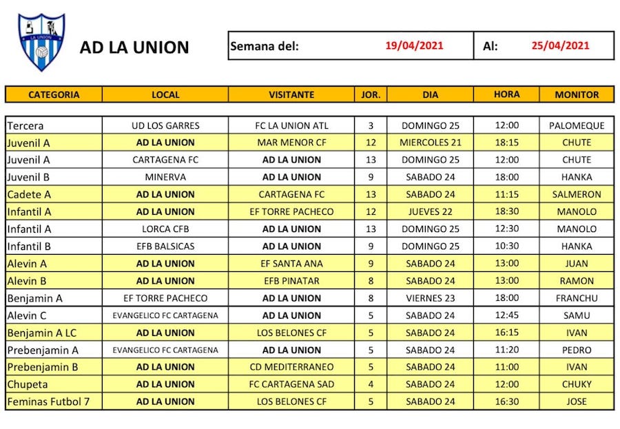 Horarios de los partidos de La Unión Atlético, AD La Unión y AD Portmán Ath. de fútbol, CD Vedruna de fútbol sala, CB Sierramar y CD Vedruna de baloncesto y Algar Surmenor de voleibol femenino en sus compromisos de ligas federadas autonómicas este fin de semana.
