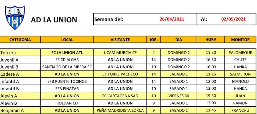 La Unión Atlético de Tercera División, con el billete para las eliminatorias de ascenso ya en su mano, recibe al UCAM Murcia B el domingo con el objetivo de sumar los tres puntos para no poner en peligro la primera posición que ocupa en su grupo. En baloncesto, el equipo Bernabé Abogados CB Sierramar inicia la fase por el título en categoría júnior. Ofrecemos horarios de nuestros equipos de fútbol base, fútbol sala baloncesto y voleibol en sus compromisos de este fin de semana.