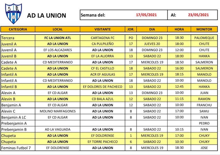 Horarios de los partidos de fútbol, fútbol sala, baloncesto y voleibol de los equipos de competiciones federadas de la AD La Unión, CD Vedruna, CB Sierramar y Surmenor.