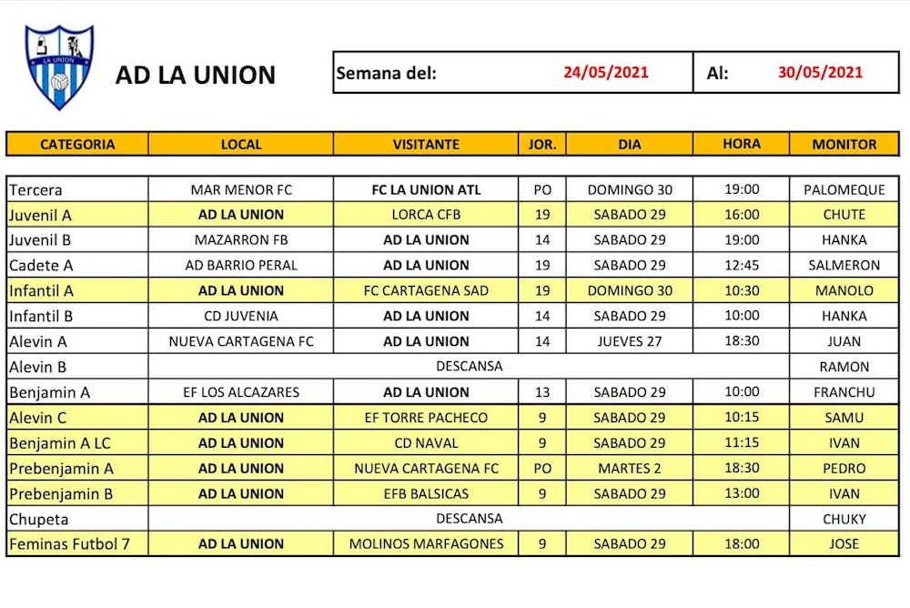 La actividad del fin de semana comienza esta tarde en Roche, pues en su pabellón disputa todos los partidos de esta jornada Surmenor de voleibol femenino. También entran en liza los equipos de fútbol de la AD La Unión y de AD Portmán Athlétic, de fútbol sala del CD Vedruna y de baloncesto del CB Sierramar y Vedruna. El gran foto está en Tercera División, donde La Unión Atlético se juega seguir aspirando al ascenso en el campo del Mar Menor en la tarde del domingo.