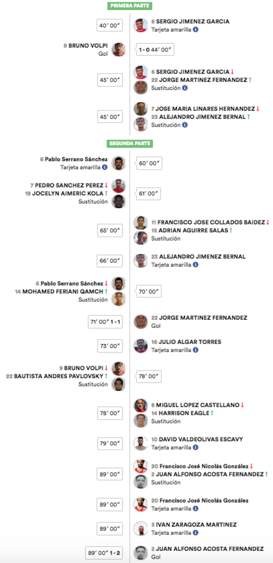 El Lorca, que fue mejor en el primer tiempo, se adelantó en el marcador con un remate de Bruno Volpi en el minuto 44 tras un centro al área, pero el conjunto de Palomeque no se vino abajo, cambio para mejor su ritmo de juego y demostró el potencial de la plantilla formada para este temporada dando la vuelta al marcador tras el intermedio. Primero llegó el empate con un gol de Jorge a los 25 minutos de este período y se dio la vuelta al marcador con el tanto de Juan Acosta.